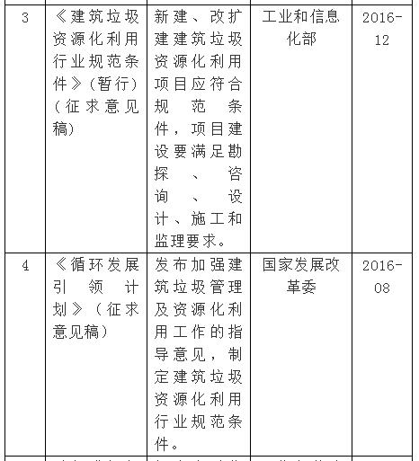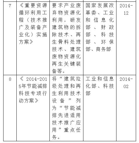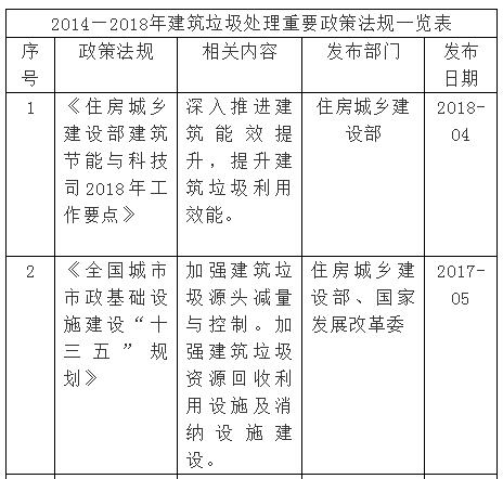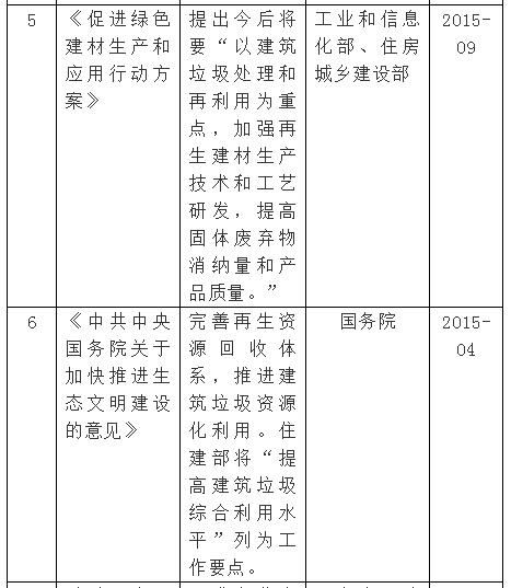 長(zhǎng)期以來,由于缺乏統(tǒng)一完善的建筑垃圾管理辦法和良好的產(chǎn)業(yè)扶持政策致使建筑垃圾絕大部分未經(jīng)任何處理便被露天堆放或簡(jiǎn)易填埋,如何處理和利用建筑垃圾,已經(jīng)成為政府所面臨的一個(gè)重要難題。為了解決建筑垃圾處理難題,促進(jìn)建筑垃圾循環(huán)利用,國家近幾年頒布了一系列的政策法規(guī),具體政策如下: