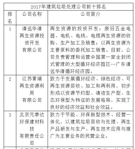根據(jù)《中國報(bào)告大廳網(wǎng)》匯總信息得知,截至2017年底,通過對(duì)建筑垃圾處理行業(yè)各項(xiàng)數(shù)據(jù)統(tǒng)計(jì),建筑垃圾處理公司排名前十的分別是清遠(yuǎn)華清、江蘇黃埔、元泰達(dá)、天實(shí)偉創(chuàng)、上海山美、德濱環(huán)保、鼎盛工程、凱興礦山、一帆機(jī)械、黎明重工,詳細(xì)情況介紹如下: