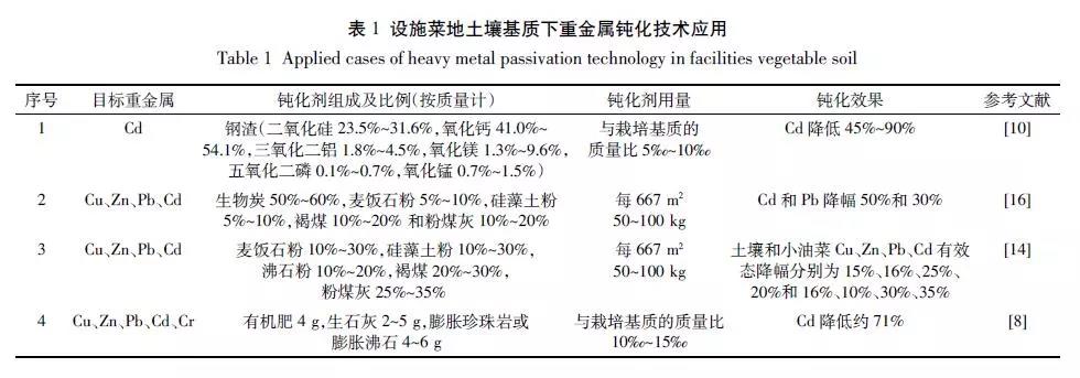 設施菜地土壤基質(zhì)重金屬的鈍化技術的研究方法以田間試驗為主,少量采用實驗室內(nèi)試驗的方法。涉及的主要污染物有Pb、Cd、Cr、Cu、Zn 5種。用到的鈍化劑主要有(1)黏土礦物,如麥飯石粉、硅藻土粉等;(2)碳材料,如秸稈炭等;(3)硅鈣材料,如生石灰、珍珠巖等;(4)有機物料,如褐煤等;(5)工業(yè)廢棄物,如粉煤灰、鋼渣。每667 m2土壤中重金屬鈍化劑的用量為50~100 kg。鈍化劑組分中,按質(zhì)量百分比計,生物炭50%~60%、麥飯石粉5%~30%、硅藻土粉5%~30%、褐煤10%~30%、粉煤灰10%~35%、有機肥40%、生石灰20%等。對比不同元素的鈍化效果,土壤中重金屬有效性平均降幅為Cd(29%)>Zn(24%)>Pb(23%)>Cu(22%),差異性不顯著。然而,蔬菜中重金屬有效性平均降幅為Cd(53%)>Pb(31%)>Cu(12%)>Zn(11%)。麥飯石、硅藻土、沸石土等非金屬礦物均具有較強的吸附、離子交換等特性,此類礦物及其改性產(chǎn)物與生態(tài)環(huán)境具有良好的協(xié)調(diào)性,已廣泛應用于無機和有機污染的處理。試驗證明,重金屬鈍化劑對土壤和小油菜Cu、Zn、Pb、Cd 有效態(tài)降幅分別是15%、16%、25%、20%及16%、10%、30%、35%,可單獨施入設施菜田,也可與底肥混拌后施用。生物炭具有多孔性、較大的比表面積、較強的表面吸附能力、高度的化學惰性,對有機和無機污染物具有高度的親和力,可作為土壤中污染物的鈍化劑。生物炭配施麥飯石、硅藻土、褐煤、粉煤灰為主要原料的鈍化劑,Cd 和Pb降幅可以實現(xiàn)50%和30%。鋼渣作為大量存在的工業(yè)廢棄物,能夠顯著降低植株中的Cd 45%~90%,其效果優(yōu)于粉煤灰、赤泥和石灰(表 1)。