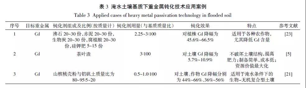 現(xiàn)有的一些鈍化劑具有氧化特性,因此只適用于旱地土壤(耗氧條件),長期淹水條件下有可能因還原變性而喪失固定能力。淹水土壤基質(zhì)重金屬的鈍化技術研究以田間試驗為主,少量采用實驗室內(nèi)盆栽方法。涉及的主要污染物為Cd。用到的鈍化劑主要有(1)黏土礦物,如沸石等;(2)碳材料,如生物炭等;(3)硅鈣材料,如硅鉀肥、鋁礬土復合制劑等;(4)有機物料,如腐植酸、茶葉渣及山核桃殼粉等;(5)工業(yè)廢棄物,如赤泥、污泥等。鈍化劑的用量為土壤基質(zhì)質(zhì)量的0.5%~3%,對土壤Cd 的降幅為5.7%~66%,對作物Cd的降幅為36%~66.5%。以湘中某工礦區(qū)稻田淹水土壤受到了嚴重的重金屬污染為例,污染程度為Cd> Pb > Zn。在淹水3、6、9 個月后,Zn、Cu、Pb、Cd 的殘渣態(tài)基本保持不變,說明短時間的處理對原生相重金屬的影響不大。4 種重金屬形態(tài)均以殘渣態(tài)最低,特別是Cu 和Cd。山核桃殼富含纖維素和半纖維素等生物質(zhì),吸附能力較強,已見利用山核桃殼對水環(huán)境中Cu、Cr、Hg、Cd 等的吸附效果,然而相對于水環(huán)境,吸附土壤重金屬的影響因素更為復雜。鋁礬土為明礬煉制過程中的副產(chǎn)物,磨碎后具有粒度細、分散性好、比表面積大等特點。郭彬等首次公開了將山核桃殼和鋁礬土開發(fā)為土壤重金屬鈍化劑的報道,對土壤、作物Cd 降幅分別為44%~66%、36%~56%。楊占彪等首次公開了茶葉渣作為鈍化劑應用于土壤Cd 污染,Cd 降幅為5.7%~10.9%。施入茶葉渣不會破壞土壤的結構,還可以提高肥力,制備方法簡單,成本幾乎為零(表3)。不同鈍化劑對于不同種類和性質(zhì)的重金屬鈍化效果存在一定差異,因而,在實際應用中對重金屬具有一定的選擇性;對于復合污染土壤來說,單一的鈍化劑很難達到修復應用的標準。