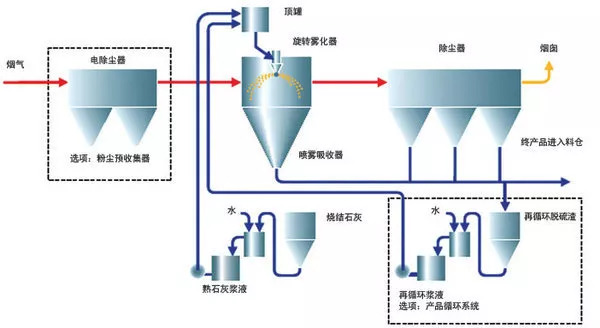該脫酸方法為通過石灰漿制備系統(tǒng)將生石灰制備成石灰漿溶液,然后通過一個水泵加壓到一個高速旋轉(zhuǎn)的霧化器將霧化的溶液均勻注入反應塔內(nèi)與塔內(nèi)流動的煙氣反應,去除酸性氣體。不做詳細解釋。