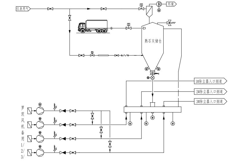 該脫酸方法是利用風機的壓能將消石灰粉末噴射到反應塔出口的煙道中,使得消石灰與煙道流過的煙氣中的酸性成分發(fā)生中和反應,去除酸性氣體。