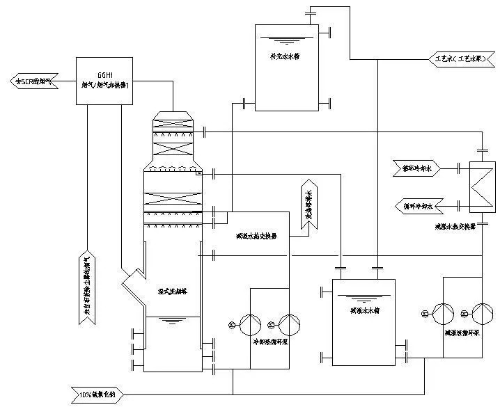 濕法脫酸工藝是利用堿性吸收劑(一般為NaOH溶液)在洗滌塔內(nèi)吸收HC1和SO2等酸性氣體。濕法凈化工藝凈化效率很高,國外多年的應用業(yè)績均表明其對HC1的脫除效率可達99%以上,對SO2也可達到95%以上的脫除效率。但是濕法凈化工藝后續(xù)需要配置廢水處理設施,且處理后煙氣溫度一般為6O~70℃,為防止煙囪出口有“白煙”冒出,還需要配置煙氣再加熱裝置,在國內(nèi)還沒有應用實例,可作為干法和半干法凈化工藝之后的尾氣深度凈化措施。