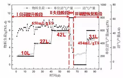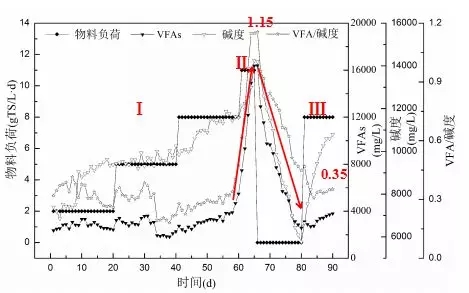 對(duì)于反應(yīng)器運(yùn)行過(guò)程中堿度和有機(jī)酸濃度的變化,VFA/堿度基本在0.4以?xún)?nèi),表明反應(yīng)器運(yùn)行較為穩(wěn)定,VFAs、堿度和VFA/堿度均急劇上升。