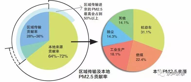 2014年4月,北京正式發(fā)布PM2.5來(lái)源解析最新研究成果:全年P(guān)M2.5來(lái)源中,區(qū)域傳輸貢獻(xiàn)約占28%至36%,本地污染排放貢獻(xiàn)占64%至72%。在本地污染貢獻(xiàn)中,機(jī)動(dòng)車排放比例最高,達(dá)31.1%。一些特定空氣重污染過(guò)程中,通過(guò)區(qū)域傳輸進(jìn)京的PM2.5會(huì)占到總量的50%以上。