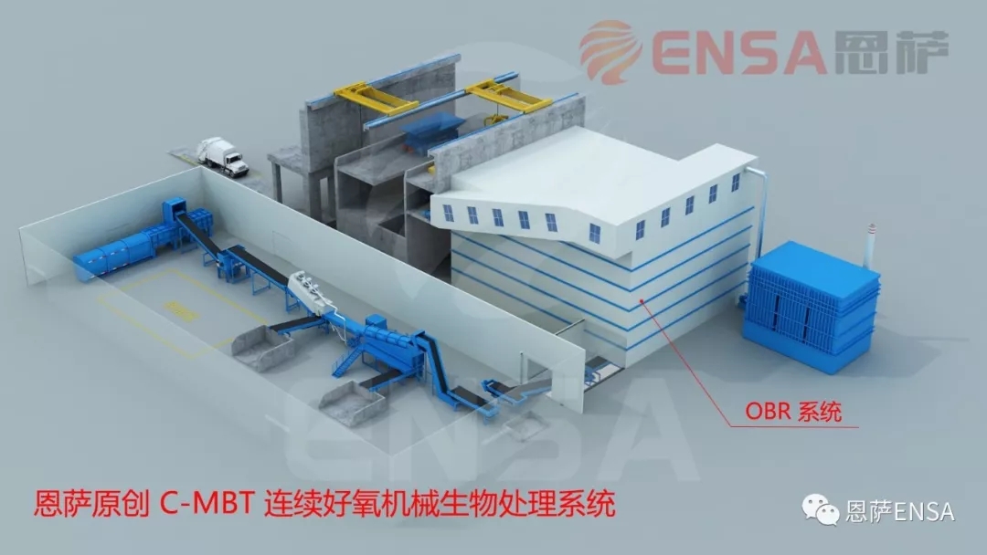 為解決上述問題,恩薩原創(chuàng)性地提出大規(guī)模智能連續(xù)好氧機(jī)械生物處理技術(shù)(以下簡稱“C-MBT”,即:Continuous Mechanical Biological Treatment),即采用 OBR 連續(xù)高效好氧生物反應(yīng)器(恩薩專利)技術(shù)(以下簡稱“OBR”, 即:Oxic Bio-Reactor ),針對已經(jīng)過初步破碎預(yù)處理后的生活垃圾等物料,在封閉的環(huán)境下,以連續(xù)進(jìn)出料和自動翻拋的方式持續(xù)好氧發(fā)酵的過程,從而在相對較短的發(fā)酵時(shí)間內(nèi)持續(xù)獲得較低含水率的高熱值物料。