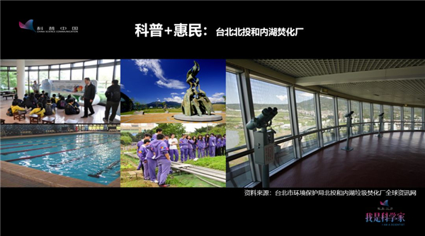 這是在臺北建設(shè)的北投和內(nèi)湖垃圾焚燒廠,這里有環(huán)境教育教室,有游泳池為周邊的居民和周邊的中小學(xué)提供免費(fèi)的游泳服務(wù),有建立在煙囪頂部的旋轉(zhuǎn)餐廳。如果垃圾焚燒廠煙囪里面有污染物質(zhì)超標(biāo)排放,那么餐廳這個位置應(yīng)該是最容易受到污染的,而事實上排放是達(dá)標(biāo)的。大家可以在這里用餐、休息、觀景,沒有安全的隱患。