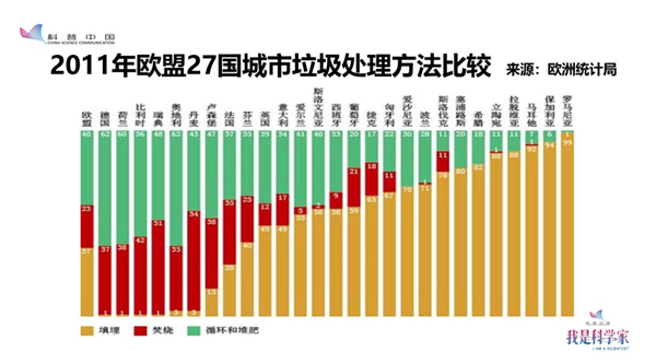 通常來說垃圾有三種處理方式:資源的循環(huán)再利用,垃圾的衛(wèi)生填埋和垃圾的焚燒發(fā)電。通過這張圖,我們可以分析得出一個結(jié)論:歐盟國家中經(jīng)濟(jì)生活水平比較低的國家,最主要的處理方式是填埋。