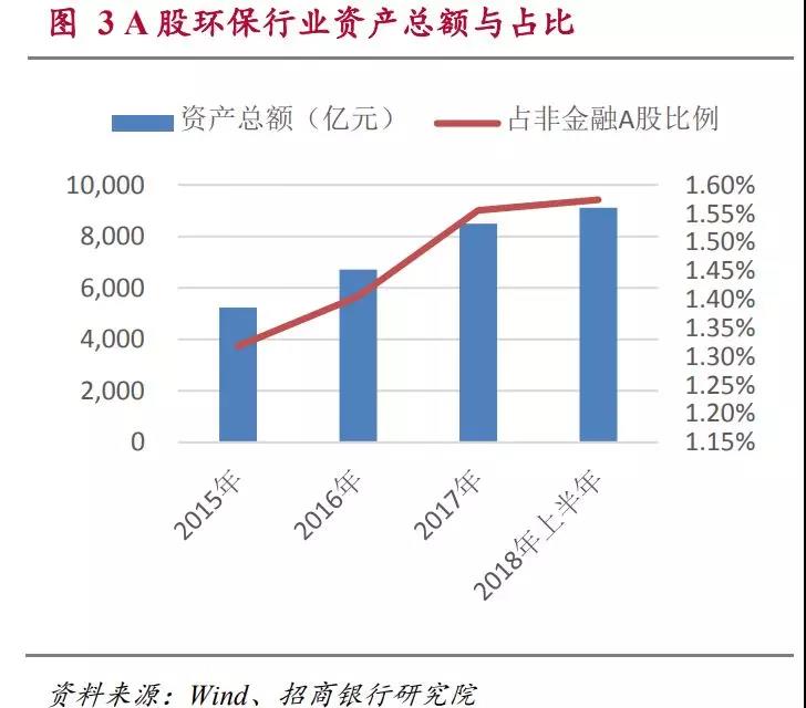 上市公司中,環(huán)保行業(yè)資產呈現逐步增長的趨勢。從2015年底到2018年上半年,環(huán)保行業(yè)A股上市公司的資產總額從5231億增加到9124億,年復合增長率為24.9%,快于A股總體資產的增長。本行業(yè)資產占A股總資產的比重從2015年年底的1.32%,上升到2018年的年中的1.57%。