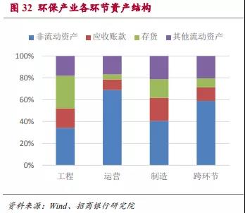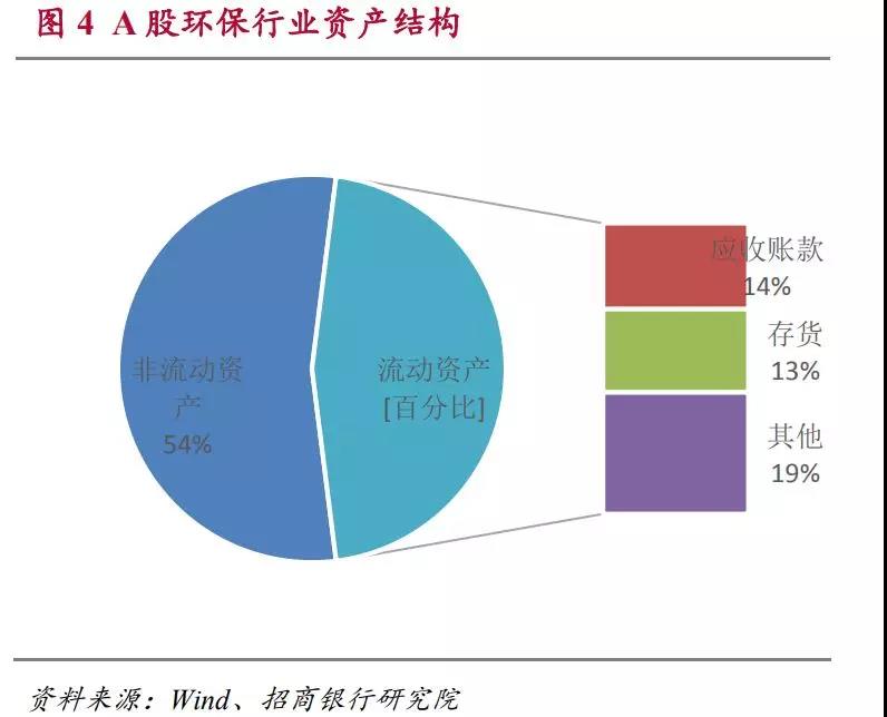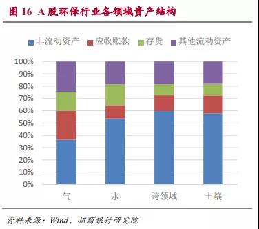 在環(huán)保類上市公司的資產結構中,非流動資產占比偏高,占到54%。而在46%的流動資產中,應收賬款和存貨的占比較高,這兩項分別占總資產的14%和13%。而其他流動資產合計僅占到總資產的19%。