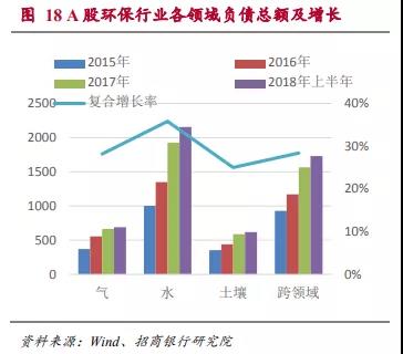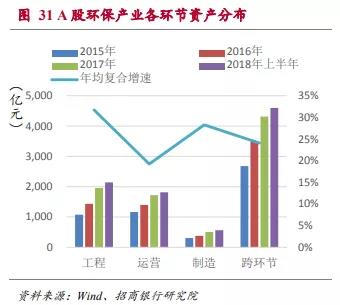 ■ 總資產規(guī)模占到A股上市公司的1.57%。截至2018年上半年,A股環(huán)保類上市公司資產總規(guī)模9124億,占A股總資產規(guī)模的1.57%。其中水體環(huán)保領域是最大的領域,其資產占所有環(huán)保行業(yè)A股上市公司總資產的41.44%,并以年均27%的復合增速增長。依托核心競爭力,縱向擴張成為A股環(huán)保類上市公司尋求增長點的主流模式,跨環(huán)節(jié)運營企業(yè)的資產規(guī)模占55%。