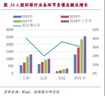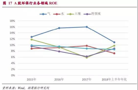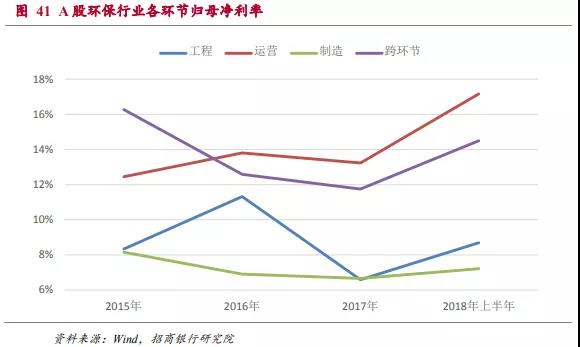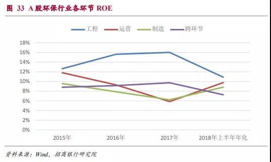 2015年到2017年環(huán)保類上市公司的ROE分別為9.4%、9.0%和8.3%,有逐年下降的趨勢(由于環(huán)保工程類項目大多數結算集中于下半年,2018年上半年年化以后的ROE水平明顯略低屬于正常情況)。在后文的分析中可以看出行業(yè)ROE水平的下降主要是受到運營和制造環(huán)節(jié)ROE下滑的影響。2018年上半年這兩個領域的ROE水平已經開始回升,因此整體行業(yè)ROE下滑的趨勢可能會改變。