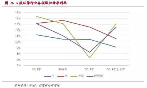 ■ 收入正經歷第二輪高速增長期,利潤率逐漸下降。行業(yè)整體收入經歷了09-11年和15至今兩輪快速增長,分別與大氣環(huán)保和水體環(huán)保領域的大幅度投入相關。而水體環(huán)保的投資金額可能明顯高于大氣環(huán)保,時間跨度也更長,因此本輪周期持續(xù)的時間也可能更長。由于市場參與者增加,行業(yè)歸母凈利率近四年逐漸下滑;而行業(yè)整體ROE下降后,對社會資本的吸引力也會下降。預計這一指標后續(xù)可能逐步企穩(wěn)。