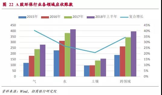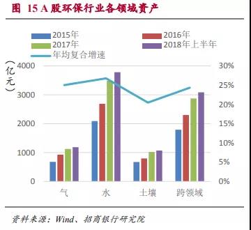 在各領域的資產中,水體環(huán)保的資產在A股環(huán)保行業(yè)資產中占比最高,2018年上半年占到了41.44%。同時這一領域增速也是最快的,達到26.76%。由于水體環(huán)保在未來的3-5年內還將是我國環(huán)保治理的重點領域。我們預計這種趨勢還將持續(xù)一段時間。另外,隨著非電工業(yè)“超低排放”標準的推行,未來大氣環(huán)保在全領域中的資產占比或也將有所提升。