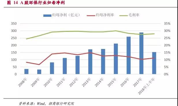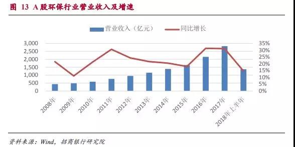 十年來,A股環(huán)保上市公司的營業(yè)收入經歷了兩輪快速成長期,分別是09-11年和15-17年。這兩輪營收的高增長分別對應了大氣治理和污水處理的高投入期。由于污水處理的投資額可能遠遠高于大氣治理,時間跨度也會較長,所以我們判斷這一輪環(huán)保行業(yè)的高增長期可能會持續(xù)較長的時間。