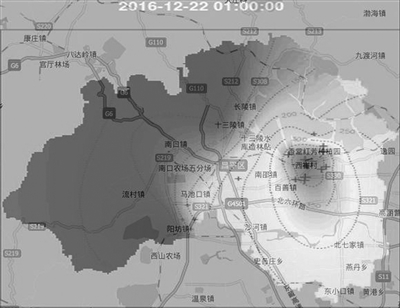 2016年12月22日,北京市發(fā)生重污染天氣過(guò)程。昌平區(qū)環(huán)保部門(mén)正是通過(guò)以上的熱力圖判斷本時(shí)間點(diǎn)昌平區(qū)西部地區(qū)的空氣質(zhì)量較好,重污染重點(diǎn)區(qū)域集中在崔村鎮(zhèn),并以此為中心向四周擴(kuò)散。
