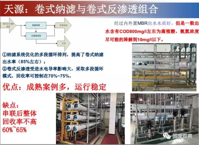 在天源環(huán)保預處理系統(tǒng)中,進入調(diào)節(jié)池前首先經(jīng)過專用纖維處理器,減少毛發(fā)、固體顆粒等來減少污泥沉積;厭氧工藝中,研發(fā)了高效外盤管循環(huán)厭氧UASB反應器,專適用于焚燒廠水質的UASB厭氧工藝,提升厭氧效率,對COD的降解達到90%以上;MBR系統(tǒng)方面,天源環(huán)保的研究更為深入,主編了國家垃圾滲濾液MBR的標準:《生活垃圾滲濾液膜生物反應系統(tǒng)技術規(guī)程》 CJJ/T 264-2016。MBR系統(tǒng)是生化系統(tǒng)和超濾膜系統(tǒng)的有機結合,生化系統(tǒng)采用兩級A/O處理工藝,確保對氨氮和COD的去除率高,超濾“出水達量”。