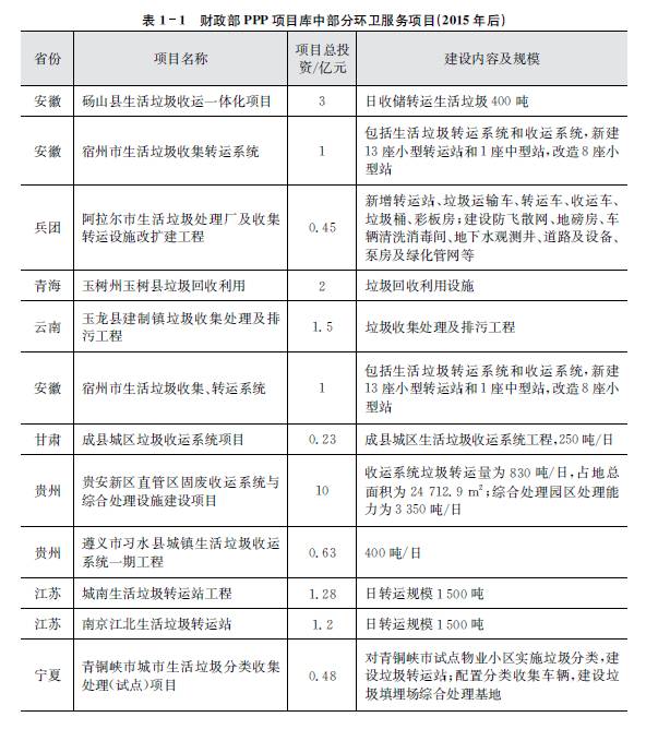 2015年開始,PPP模式在各地公用市政行業(yè)全面展開,業(yè)內(nèi)人士稱之為PPP元年。伴隨整個市場大環(huán)境,環(huán)衛(wèi)服務(wù)行業(yè)的市場化也已經(jīng)大幕開啟,越來越多的環(huán)衛(wèi)領(lǐng)域的項目開始公開招標。各地開始出現(xiàn)一些分包作業(yè)或者環(huán)衛(wèi)一體化PPP項目,包含垃圾清運、道路清掃、設(shè)施維護等環(huán)衛(wèi)作業(yè)內(nèi)容,或打包招標。較為典型的是2015年海口市環(huán)衛(wèi)一體化建設(shè)全面引入PPP模式項目,4個區(qū)分別由北京環(huán)衛(wèi)集團、龍馬環(huán)衛(wèi)和深圳玉禾田公司中標。2015年財政部建立的PPP項目庫中首次出現(xiàn)了17個環(huán)衛(wèi)項目,總規(guī)模約42億元,主要以垃圾清運項目為主。截至目前通過2015年財政部建立的PPP項目庫檢索生活垃圾相關(guān)的PPP項目,有多達202條項目記錄,包含生活垃圾清運、轉(zhuǎn)運、分揀、終端處理設(shè)施新建和改擴建等項目。
