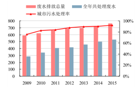 2015 年我國污水排放總量達 759.2 億噸,較 2014 年同比增長 6%,2015 全年共處理污水 527.7 億噸,同比增長 6.8%,處理廢水量與廢水排放總量的差距不斷縮小,廢水處理能力不斷上升。2015 年我國城市污水 561.3億噸,處理率已經(jīng)到達 91.8%,根據(jù)《“十三五”全國城鎮(zhèn)污水處理及再生利用設施建設規(guī)劃》的要求,到 2020 年,城市污水處理率要達到 95%,仍有一定的發(fā)展空間。