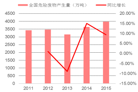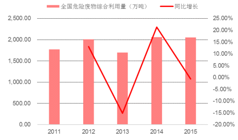 隨著我國經(jīng)濟的發(fā)展與工業(yè)化水平的提高,全國危廢的產(chǎn)生量呈現(xiàn)出迅速增加的態(tài)勢。根據(jù)數(shù)據(jù),近年來,全國危廢綜合利用處置率保持在 80%左右。2015 年危廢產(chǎn)生量 3976 萬噸,綜合利用量 2050萬噸,處置量 1174 萬噸,綜合利用處置率為 81.08%。