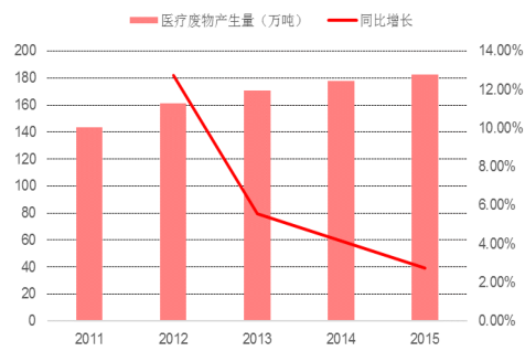 同年,我國醫(yī)療廢棄物產(chǎn)生量為 182.43 萬噸,其中住院部門產(chǎn)生的廢物量占全部醫(yī)療廢物的 83%。然而大量的高傳染性、高毒性危害性廢物卻沒有得到妥善處置,2015 年全國 261 個大、中城市醫(yī)療廢物處置量為 62.2萬噸,處置率僅約為全國醫(yī)療廢物產(chǎn)生量的三分之一。
