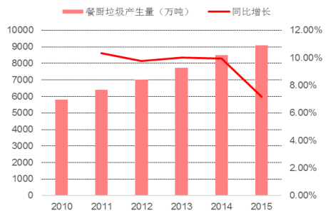 根據(jù)數(shù)據(jù),北京市每天產(chǎn)生 1200 噸餐廚垃圾。統(tǒng)計數(shù)據(jù)表明,中國城市每年產(chǎn)生餐廚垃圾不低于 6000 萬噸。近年來我國經(jīng)濟快速發(fā)展,餐廚垃圾以每年 10%的增量不斷增長。按照城鎮(zhèn)人口每人每天產(chǎn)生 0.15kg 餐廚垃圾計算,我國 2011 年的餐廚垃圾產(chǎn)生量為 3782 萬噸,到 2015 年我國的餐廚垃圾產(chǎn)生量增長到了 4222 萬噸。到“十三五”末期,我國的餐廚垃圾產(chǎn)生量將增長至 4873 萬噸,餐廚垃圾處理形勢嚴峻。