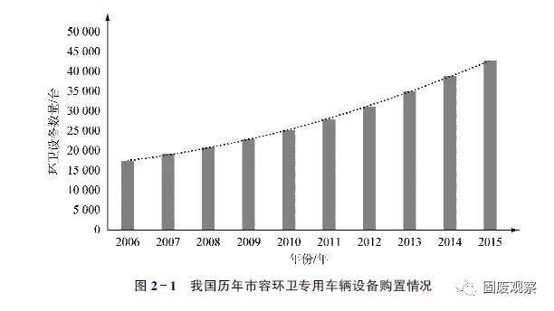 據(jù)國家統(tǒng)計局統(tǒng)計,截至2015年年底,我國城鎮(zhèn)化率已經(jīng)達到56.1%。且目前正以年均1個百分點的速度增長。2015年,全國市容環(huán)衛(wèi)專用車輛設(shè)備共42702臺,同比增加3789臺,如圖2-1所示。