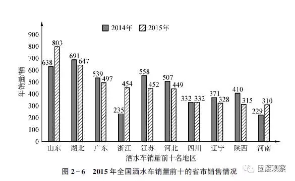 2015年,我國灑水車銷量前十名的地區(qū)有山東、湖北、廣東、浙江、江蘇、河北、四川、遼寧、陜西、河南。其中,山東省銷售超過800輛,同比增長超過25%,在2015年全國灑水車總銷量(下同)中的占有份額超過10%,同比提升2.73%;湖北、廣東、浙江、江蘇、河北分列全國灑水車分省銷量第2~6位,累計銷量均在400輛以上,占有份額分別達到8.41%、6.46%、5.90%、5.88%的5.84%。累計銷量同比,湖北和廣東分別遭遇到6%和7%以上的下降,江蘇和河北分別下降19%和11%以上。
