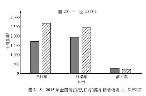 2015年,我國合計完成清掃車、洗掃車、掃路車銷售5386輛,同比增長36.01%。細(xì)分市場,洗掃車和掃路車?yán)塾嬩N量同比均實現(xiàn)增長,分別達到2700輛和2459輛,同比增幅分別在56%和25%以上,在2015年全國清掃/洗掃/掃路車總銷量中的占有率分別在50%和45%以上,同比分別增長6%和下降3%以上。