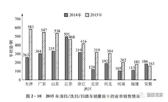 2015年,我國清掃車、洗掃車、掃路車銷售排名前十的區(qū)域有天津、廣東、山東、江蘇、浙江、北京、河北、河南、福建、安徽等,除江蘇和安徽2省之外,同比均實現(xiàn)增長,且幅度均在30%以上。