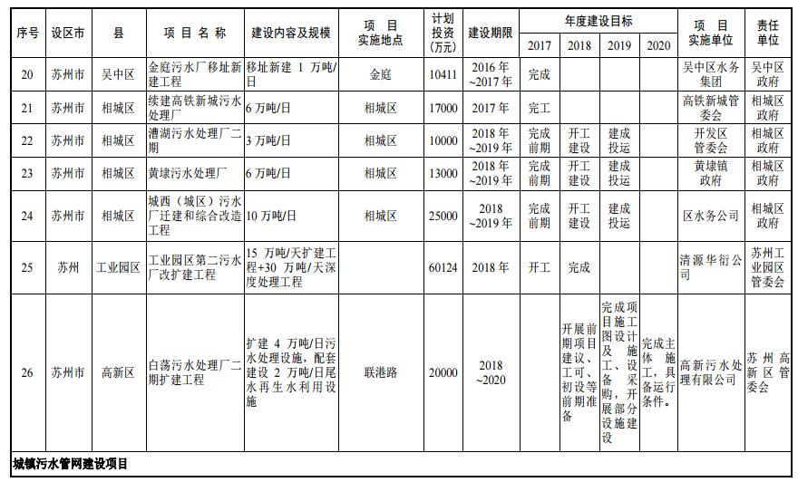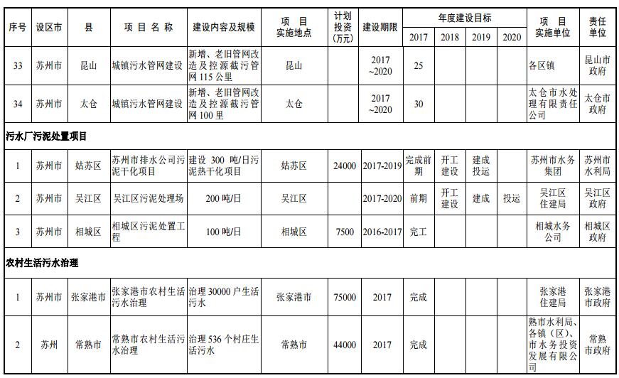 到 2020 年,蘇州市區(qū)、縣級市建成區(qū)生活污水基本實現(xiàn)全收集、全處理;全面推進城鎮(zhèn)污水處理設(shè)施建設(shè),到 2019 年,蘇州市區(qū)、縣級市污水處理率分別達到 95%、85%。到 2020 年,蘇州市區(qū)、縣級市污水處理率分別達到 98%、90%;加強污泥處理處置,2017 年底前,完成現(xiàn)有城鎮(zhèn)污水處理廠污泥處理處置設(shè)施達標改造,設(shè)區(qū)、縣級市建成城鎮(zhèn)污水處理廠污泥綜合利用或永久性處理處置。2020 年底前,縣級市實現(xiàn)永久性污泥處理處置設(shè)施全覆蓋。