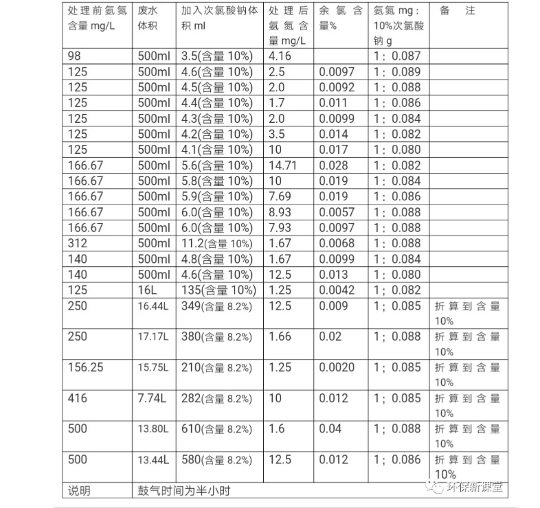1.根據(jù)實驗數(shù)據(jù)可看出,按氨氮重量mg:10%次氯酸鈉重量g=1:(0.08~0.088)時都可以使氨氮達標(biāo),但在1:0.088時處理效果最好,鼓氣半小時情況下氨氮除至最低值,且余氯含量低。