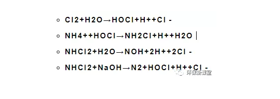 折點加氯法處理后的出水在排放前一般需要用活性碳或二氧化硫進行反氯化,以去除水中殘留的氯。1mg殘留氯大約需要0.9~1.0mg的二氧化硫。在反氯化時會產(chǎn)生氫離子,但由此引起的pH值下降一般可以忽略,因此去除1mg殘留氯只消耗2mg左右(以CaCO3計)。折點氯化法除氨機理如下: