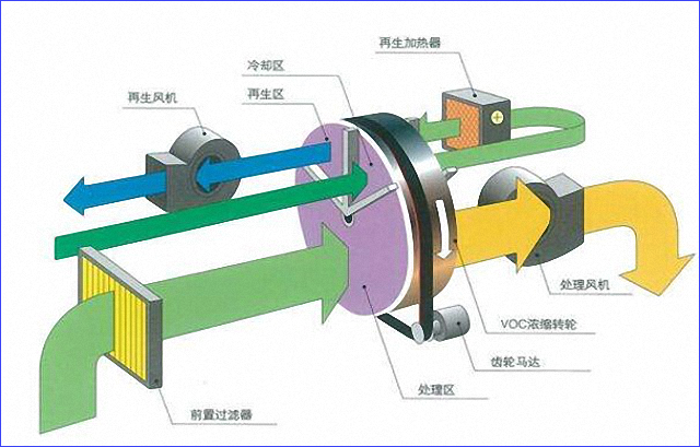 RTO系統(tǒng)的核心組成部分——沸石輪轉(zhuǎn)濃縮機(RC),可以分為處理區(qū)、再生區(qū)、冷卻區(qū)。含有VOC的被處理空氣通過過濾器后,送到濃縮轉(zhuǎn)輪的處理區(qū),VOC被吸附除去;吸附于濃縮轉(zhuǎn)輪的凈化后的空氣在再生區(qū)經(jīng)熱風(fēng)處理被脫附濃縮;濃縮轉(zhuǎn)卻在冷卻區(qū)被冷卻,經(jīng)過冷卻后的空氣,再經(jīng)加熱后作為再生空氣使用。