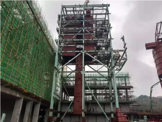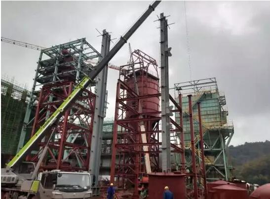 2、煙氣處理:收塵器頂部電動葫蘆吊架組拼吊裝就位;反應(yīng)塔直筒焊接,頂部電動葫蘆吊架吊裝就位;消石灰平臺鋼構(gòu)安裝;灰?guī)熘麂摌?gòu)安裝,樓梯鋼架安裝;