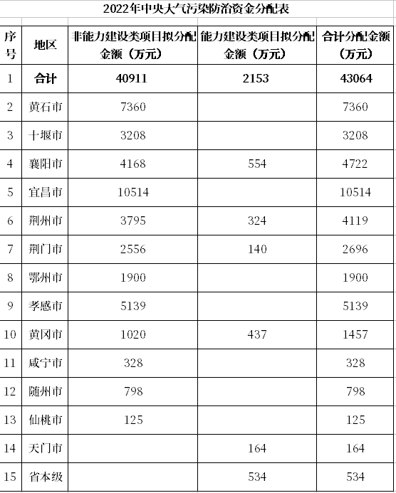 2022年4月14日,湖北省財政廳發(fā)布“關(guān)于下達2022年中央大氣污染防治資金的通知”,明確今年中央大氣污染防治資金分配情況,共43064萬元,非能力建設(shè)類項目擬分配金額40911萬元,能力建設(shè)類項目擬分配金額2153萬元。具體分配見下表: 原文如下: 省財政廳關(guān)于下達202...