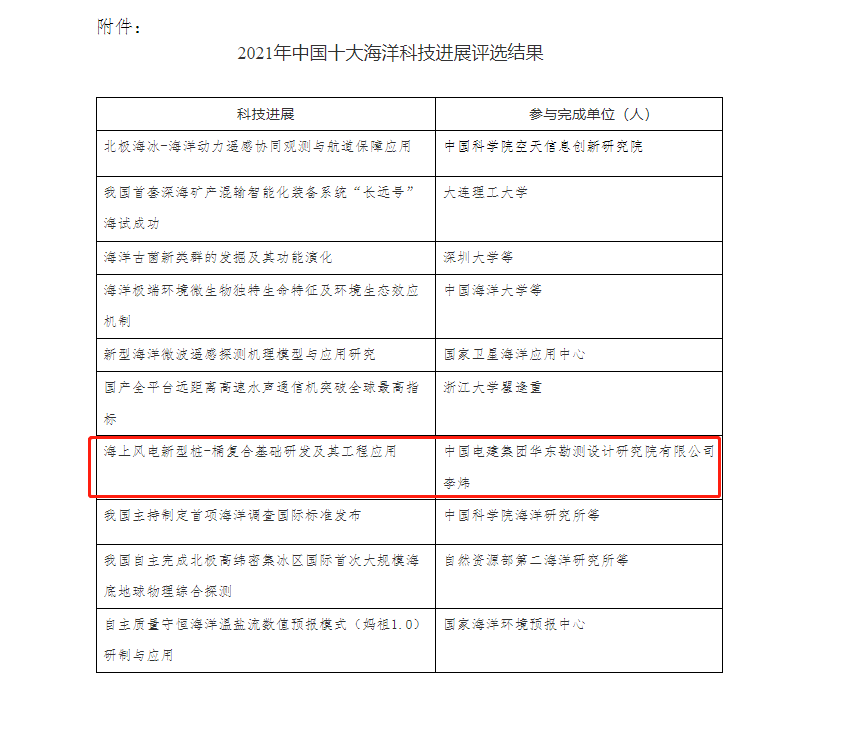 日前,華東院海上風(fēng)電“新型樁-桶復(fù)合基礎(chǔ)研發(fā)及其工程應(yīng)用”入選2021年度中國(guó)十大海洋科技進(jìn)展。這項(xiàng)由華東院發(fā)明并創(chuàng)新設(shè)計(jì)的核心技術(shù),不僅大幅提高了海上施工作業(yè)效率,也為破解海上風(fēng)電走向深遠(yuǎn)海、大機(jī)組過(guò)程中常規(guī)單樁基礎(chǔ)承載力不足等難題,提供可復(fù)制、可推廣、可借鑒的經(jīng)驗(yàn)與思路,...