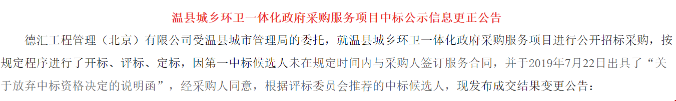 7月30日,河南省焦作市溫縣城鄉(xiāng)環(huán)衛(wèi)一體化項(xiàng)目中標(biāo)信息更正公告發(fā)布,因第一中標(biāo)候選人錦江生態(tài)未在規(guī)定時(shí)間內(nèi)與采購(gòu)人簽訂服務(wù)合同,并在7月22日出具了“關(guān)于放棄中標(biāo)資格決定的說明函”,經(jīng)采購(gòu)人同意,中標(biāo)供應(yīng)商由錦江生態(tài)變更大連明日環(huán)境,中標(biāo)價(jià)格也由5042元/年,變?yōu)?165元/年。具體如下:原中標(biāo)信...