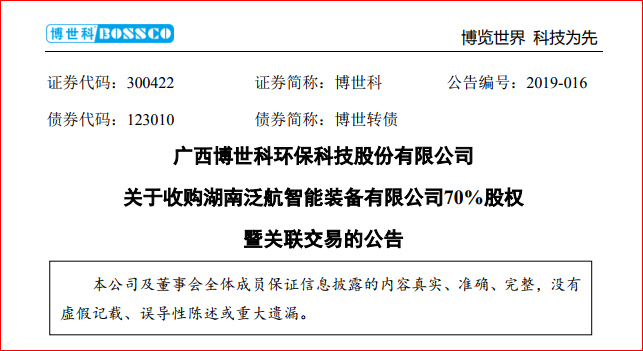 日前,廣西博世科環(huán)??萍脊煞萦邢薰?簡稱“博世科”)發(fā)布公告,公司擬收購西藏廣博環(huán)保投資有限責任公司持有的湖南泛航智能裝備有限公司(簡稱“泛航裝備”)70%股權。本次收購完成后,泛航裝備將成為公司的控股子公司。 公告顯示,標的公司泛航裝備成立于201...