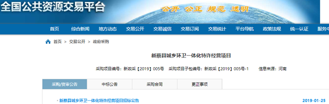 河南省新蔡縣城鄉(xiāng)環(huán)衛(wèi)一體化特許經(jīng)營(yíng)項(xiàng)目發(fā)布單一來源采購(gòu)招標(biāo)公告,擬推薦中國(guó)光大國(guó)際有限公司下屬光大生態(tài)資源(深圳)有限公司為項(xiàng)目供應(yīng)商。 擬采購(gòu)內(nèi)容:彌陀寺鄉(xiāng)、龍口鎮(zhèn)、韓集鎮(zhèn)、孫召鎮(zhèn)、李橋鎮(zhèn)、櫟城鄉(xiāng)、棠村鎮(zhèn)、宋崗鄉(xiāng)、關(guān)津鄉(xiāng)、河塢鄉(xiāng)、佛閣寺鎮(zhèn)、余店鎮(zhèn)、陳店鎮(zhèn)、磚店鎮(zhèn)、黃樓鎮(zhèn)、澗頭鄉(xiāng)、化莊鄉(xiāng)、楊莊戶鄉(xiāng)、...