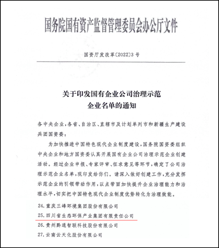 國(guó)企改革顯成效 公司治理見(jiàn)真章 四川生態(tài)環(huán)保集團(tuán)獲評(píng)國(guó)務(wù)院國(guó)資委“國(guó)有企業(yè)公司治理示范企業(yè)” 近日,國(guó)務(wù)院國(guó)資委正式發(fā)布“國(guó)有企業(yè)公司治理示范企業(yè)”名單,四川省生態(tài)環(huán)保產(chǎn)業(yè)集團(tuán)有限責(zé)任公司(以下簡(jiǎn)稱(chēng)“四川生態(tài)環(huán)保集團(tuán)”)成功入選...