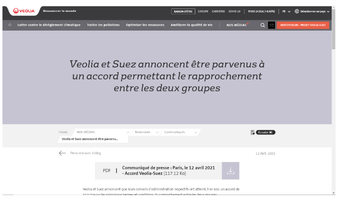 威立雅和蘇伊士宣布,昨晚(4月12日)各自的董事會原則上就兩集團合并的主要條款和條件達成協(xié)議。兩家公司以每股Suez股份20.50歐元的價格(附息票)為條件達成協(xié)議。 該協(xié)議將從工業(yè)和社會的角度出發(fā),創(chuàng)建新的蘇伊士公司,該公司的資產(chǎn)由一個連貫的,可持續(xù)的部門組成,并具有真正的增長潛力,營業(yè)額約為70...
